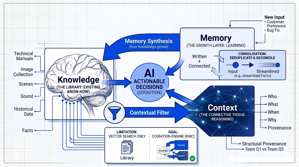 Memory, even though a simple representative word, is not a simple concept. In our research at ApertureData and Tribe Capital, Ali Nahm and I found that "Memory" is often used as a catch-all term that obscures more than it explains. Cognition or Intelligence is what enables the actual decision-making, and it requires a combination of existing knowledge, new memories, and relevant context to enable the right AI-enabled actions. Therefore, to evaluate our current set of 20 frameworks, and to help architects parse the noise, we’ve codified the Knowledge-Memory-Context (KMC) blueprint. This isn't just a technical stack. While the industry often uses these terms interchangeably, they represent three distinct layers that must interact for an AI to "think" like a colleague: